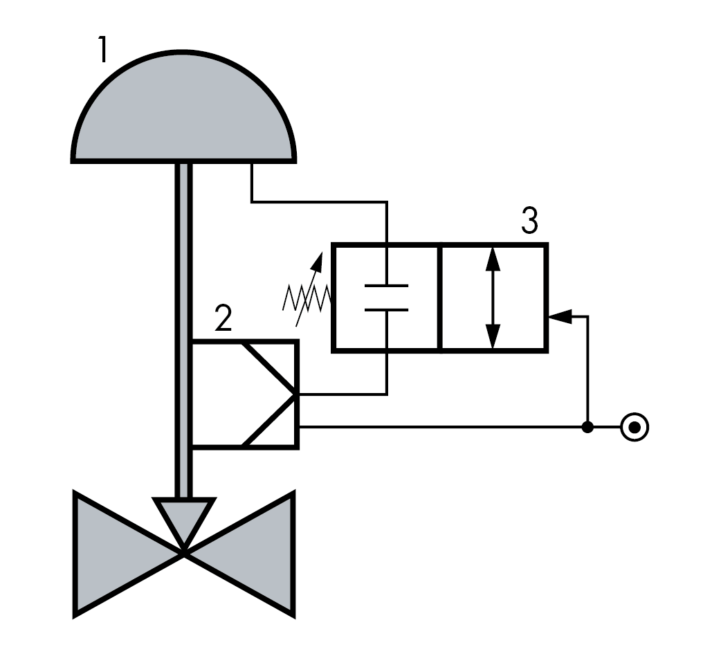 Los relés de bloqueo se utilizan para bloquear la tubería de presión de mando de los accionamientos neumáticos. Cierran la conducción de la presión de mando de la válvula de control cuando la presión de alimentación falla o no alcanza un valor previamente ajustado. El accionamiento permanece en su última posición.