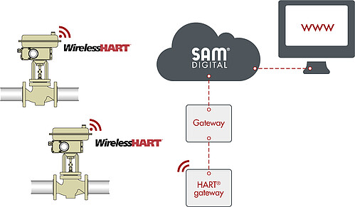 El DIGITAL LAB ofrece a SAMSON la posibilidad de simular conceptos de automatización y probar su viabilidad con equipos SAMSON. En la configuración de prueba NOA, los datos de los posicionadores instalados se leen utilizando WirelessHART® y se envían a través de una pasarela a la plataforma de gestión de activos basada en la nube SAM VALVE MANAGEMENT.