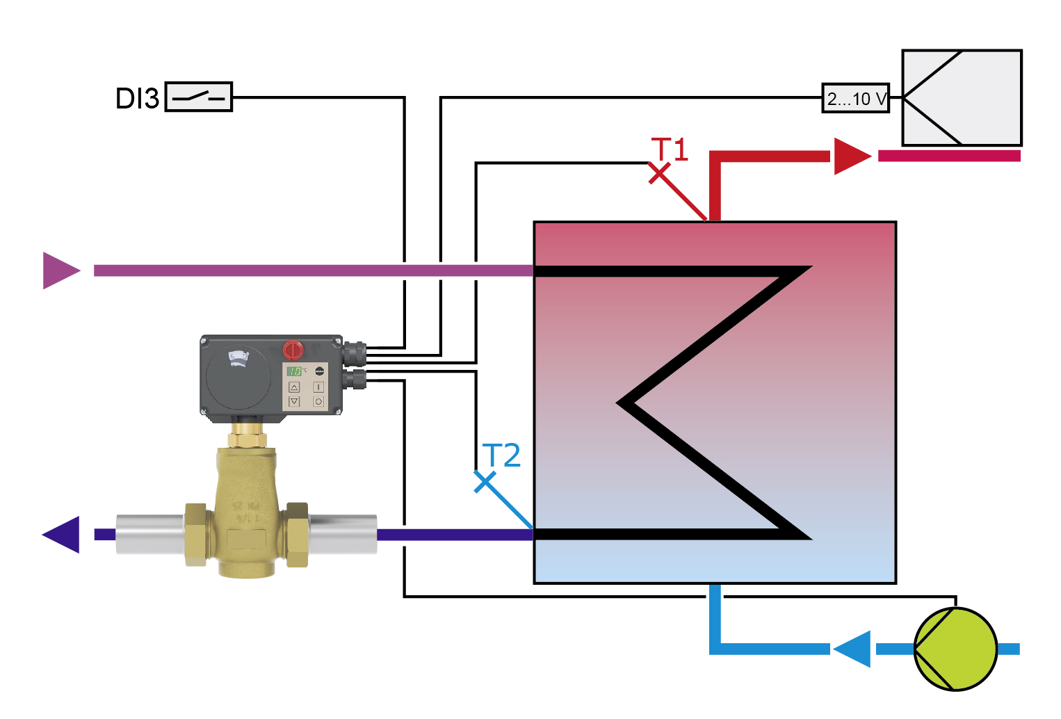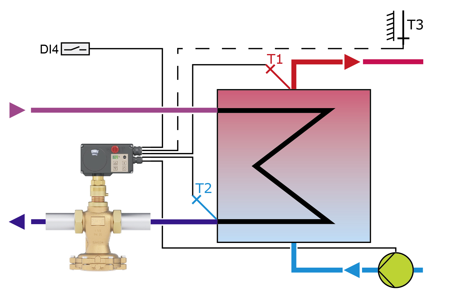 Las prestaciones que se exigen a las modernas válvulas eléctricas, también las pueden satisfacer reguladores sin energía auxiliar en tamaños de hasta DN 400 equipados con una válvula piloto para que funcionen como una unidad de control. En las redes de calor y frío se combinan válvulas reductoras de presión, estabilizadoras de presión y reguladores de presión diferencial y/o caudal con válvulas piloto eléctricas, equipadas con un accionamiento con regulador TROVIS 5824-8. De esta forma se amplían las funciones de los reguladores sin energía auxiliar, por ejemplo: